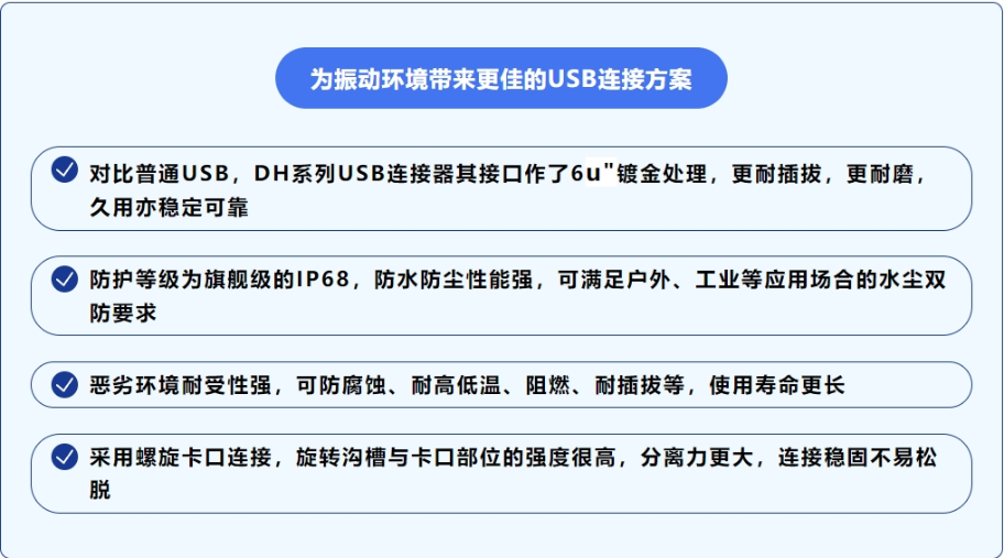 作为DH系列USB连接器,除了具备DH系列共性的卓越优势,可在复杂恶劣环境下应付自如外,其USB接口相较于普通USB接口,作了6u"镀金表面处理,耐久性更高,更耐插拔,久用电气性能不受影响,同时配置有USB2.0款和USB3.0款,前者传输速率为480Mbps,后者传输速率为5Gbps,能匹配不同传输速率的差异化方案需求。