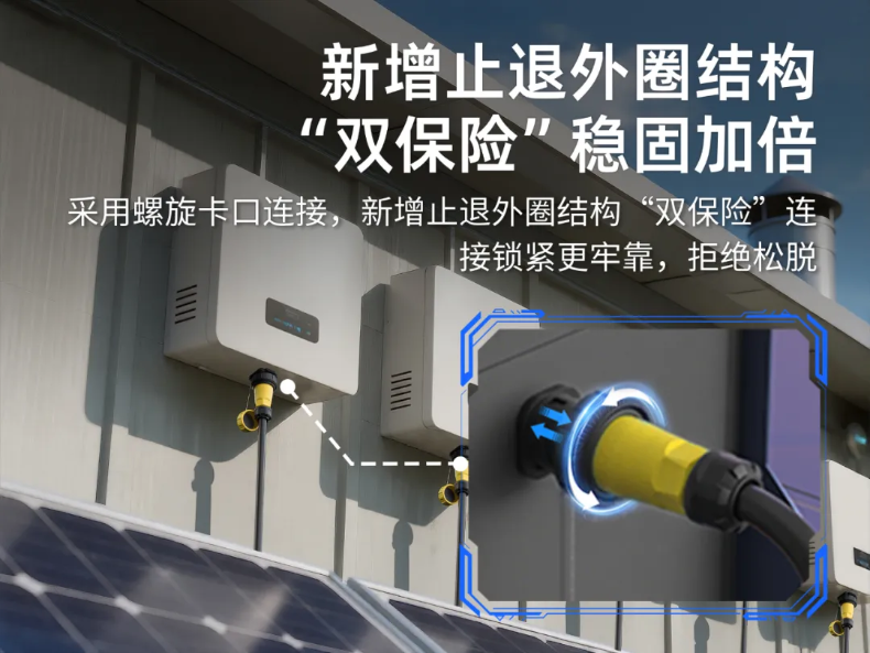 凌科DL28系列工业级大电流连接器采用了“螺旋卡口+止退外圈”双重锁定结构,连接稳固性加强,锁定牢固性有了“双保险”,面临振动与冲击,也不易松脱,从而保障逆变器电气连接可靠与安全性。