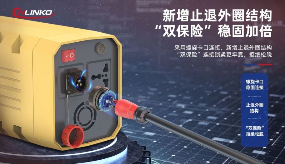 锂电池常应用于车载设备,另外锂电池系统很多是传输大电流,连接不牢靠,既会导致故障频发,也会触发触电等安全事故。凌科这款全新的工业连接器采用螺旋卡口式连接,连接更加牢固,同时新增止退外圈结构,连接“双倍牢固”,可保障长时间使用中的接触可靠性,避免因来自外力而导致的松脱而影响连接的安全性和可靠性。
