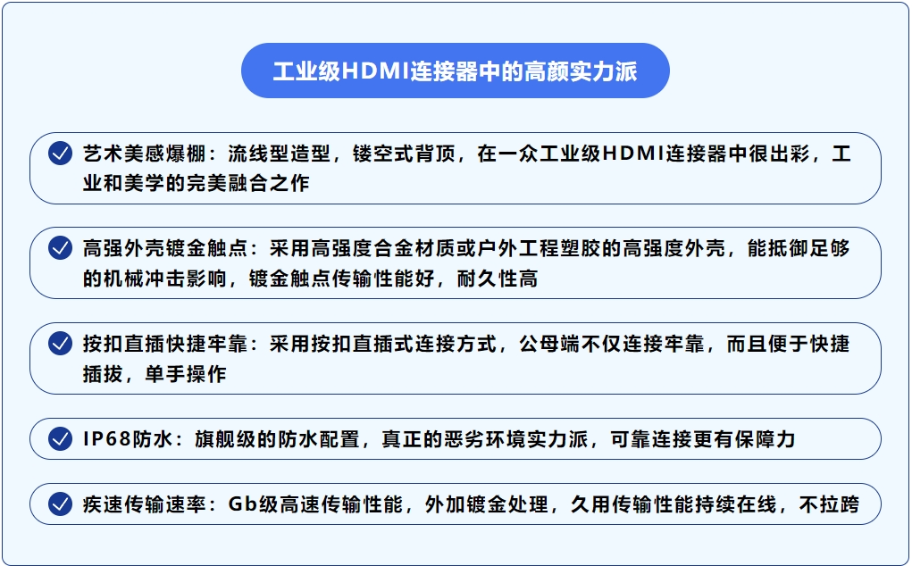 HDMI连接器是一种实现图文、视频等高速传输的高清数据连接器,其应用非常广泛,是非常主流和成熟的数据传输接口方式。对于日常布线,普通的HDMI连接器足矣,但对于户外、医疗、工业等复杂且严苛的使用场景,就需要采纳工业级HDMI连接器,才能保障可靠、安全与稳定的运行。