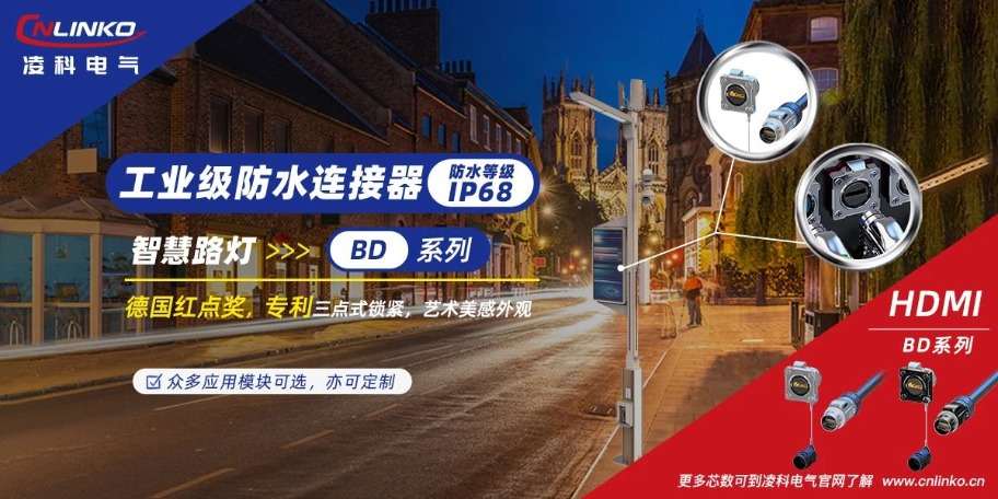 由于智慧路灯处于户外,且属于道路环境,因而多选用工业级HDMI连接器。凌科上述BD系列HDMI连接器,其流线型躯身和镂空型弧线背顶的设计,极为新潮和前瞻,高端既视感很强,同时作为一款工业级产品,HDMI接口6麦镀金,更抗磨抗腐,耐久性更高。