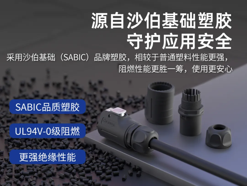 凌科上述气密连接器的外壳主体选用了性能更胜一筹的SABIC品牌工程塑胶,具备UL94 V-0阻燃等级,在意外情况下,可形成有效的防火屏障,抑制火花蔓延,提升安全性能。