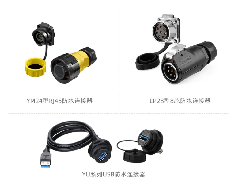 02应用产品:YM24系列RJ45工业连接器、LP28系列8芯工业连接器、YU系列USB工业连接器