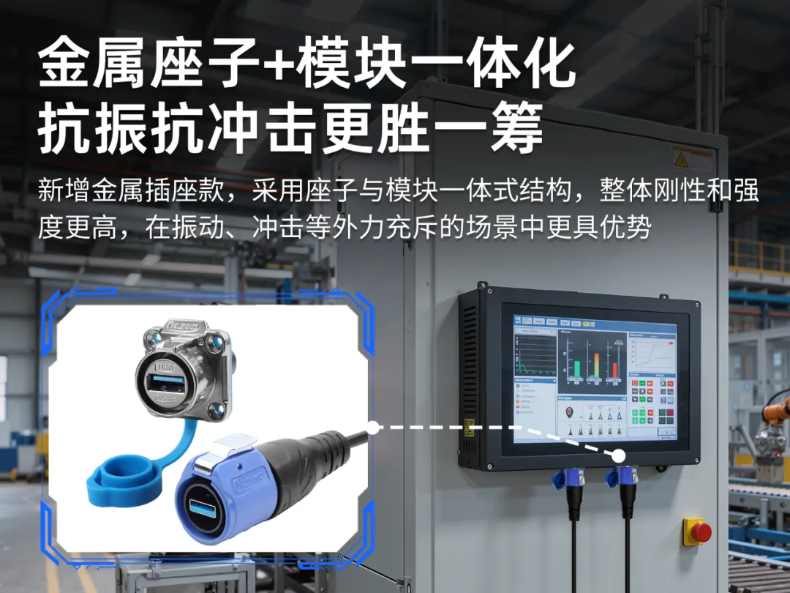 凌科上述USB金属插座与配套插头,在接口触点作了镀金等工艺处理,不仅支持USB3.0等高速协议,而且更持久耐用,能保障工控机传输的完整性和稳定性,避免卡顿、断流、延迟等现象。