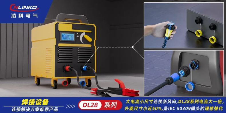 目前凌科DL28系列连接器正应用于各类焊接设备。它相较于传统IEC60309插头外观尺寸缩小近一半的突破性优势,备受行业青睐,不仅解决了焊接设备在紧凑空间内高效布线的核心诉求,更以双重锁紧防松脱、IP68/IPX9K防护、120℃耐高温、阻燃等特性,实现连接安全性、牢靠性与稳定性的三重跃升。