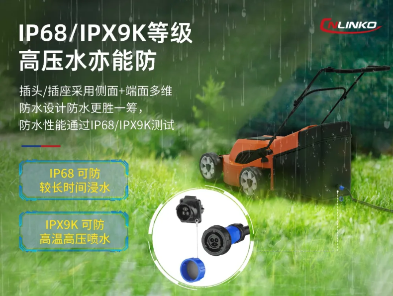 割草机充电连接器面临多重环境威胁。主要为①户外移动充电:雨水/露水侵蚀;②设备清洗维护:高压水雾冲击;③作业残留物:粉尘侵入。