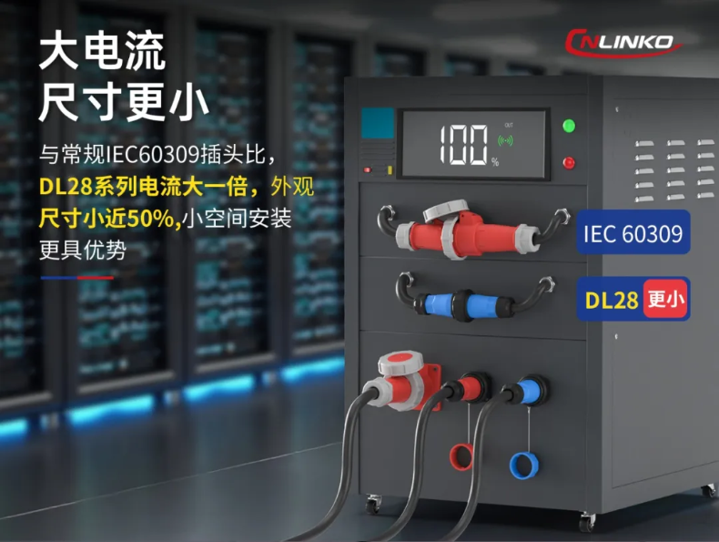 在注塑机紧凑化趋势下,以及安装空间有限的背景下,IEC60309插头因体积过大无法使用。对比IEC60309插头,凌科DL28系列连接器体积小近50%,传输电流值大一倍,可充分匹配注塑机紧凑布线场景,正成为IEC60309插头的理想替代方案,有效解决安装空间痛点。