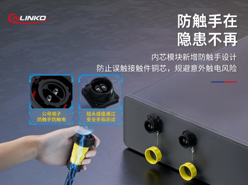 大电流、高压连接器通常会传输几十安至上百安的大电流,承载几百至上千的高压,因而其安全性至关重要。无论是公母端意外脱开还是操作者作业中误触,都可能酿成安全事故。目前常规的大电流连接器IEC60309插头,一般防触手设计不足,插针与插孔没有做防触手结构或者不够全面。