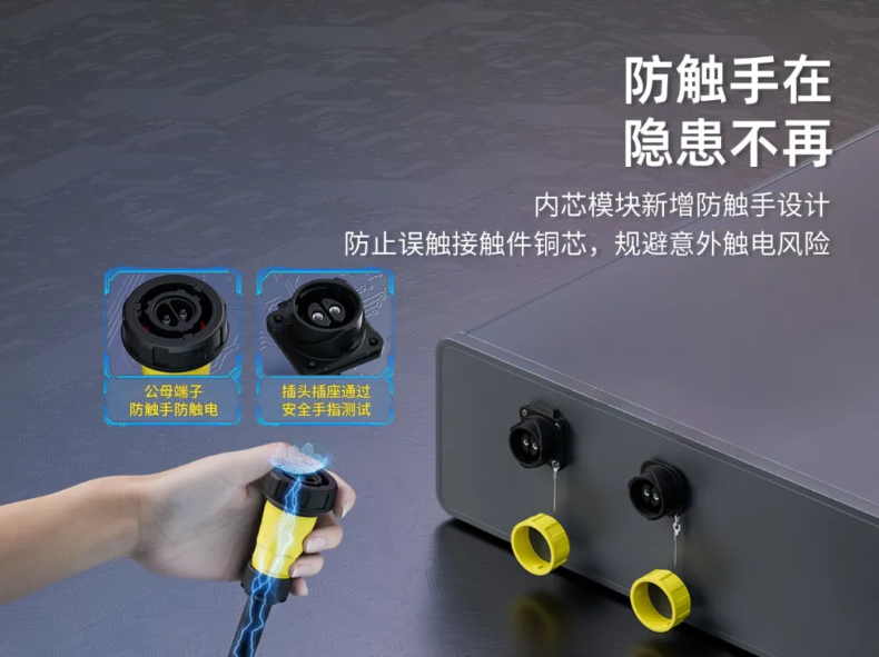 传统大电流连接器插拔时,手指可能误触带电端子,引发电弧烧伤或触电事故。