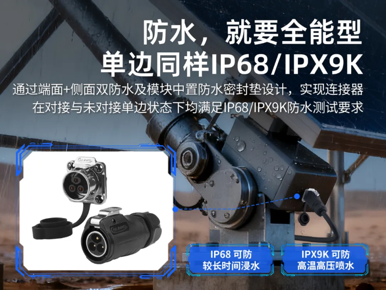 凌科此款气密性连接器在防水防尘方面的能力是毋庸置疑的,旗舰级的配置。对接状态下,为IP68/IPX9K防护等级,单边情况下亦是。因而能妥妥应对太阳能推拉杆所面临的户外环境,提供高规格、更放心的水尘双防防护支持。