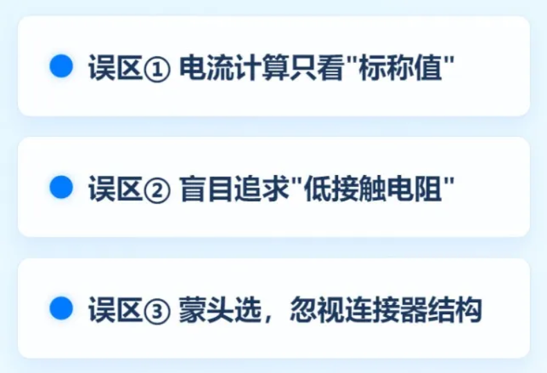 大电流连接器作为电力传输的“咽喉要道”,其选型直接影响设备可靠性。但许多工程师在选型时,往往过度依赖供应商的“标称参数”,而忽略实际工况的复杂性。本文将从3大误区出发,深度解析,助你避开“深坑”。