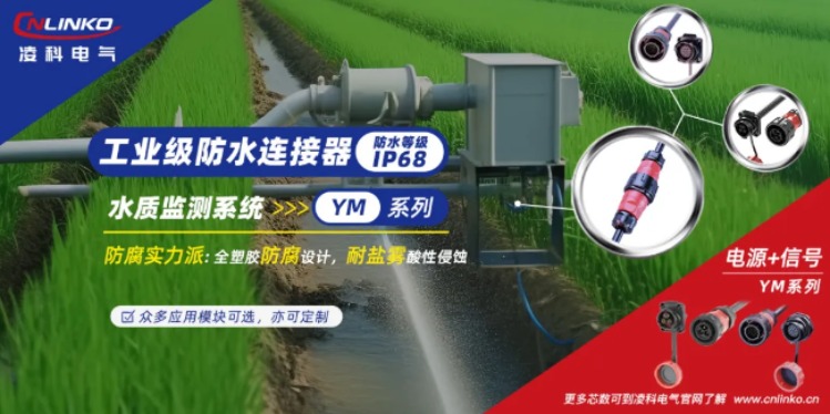 对于水质监测系统,要用到电源连接器和信号连接器。分别提供电源连接支持和传感器信号的传导。凌科YM系列工业级连接器,以严苛的设计和制造标准打造,实现IP68级高防水性能,可在水质监测系统的潮湿和水液环境下提供更强防护。