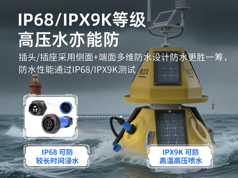 海洋环境监测设备部署周期长达数月甚至数年,无论是潮湿度极高的环境水分,还是恶劣天气裹挟着的水浪冲击,都要求设备所用连接器具备高规格的防水性能。