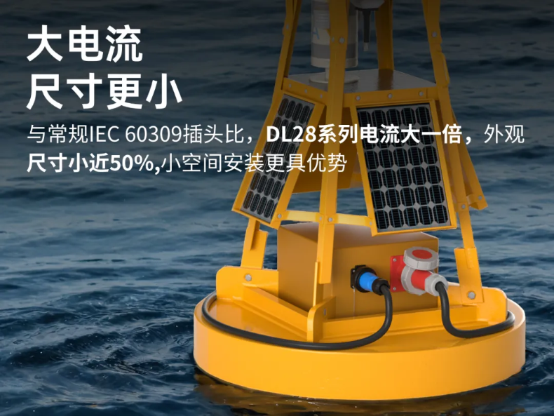 相比传统“大个子”IEC60309插头,DL28工业连接器则尽显小巧,尺寸减半,重量减轻,可有效降低监测平台负载并节省宝贵空间,充分契合海洋监测设备轻量化、紧凑化的需求。其优势主要有: