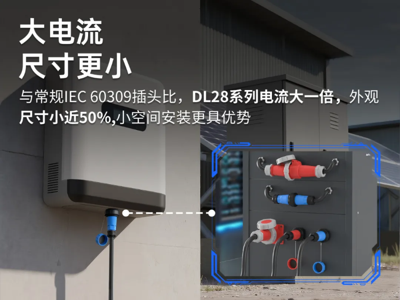 凌科这款DL28系列大电流连接器,相较于传统的IEC60309插头而言,不仅尺寸小近50%,占用安装空间更小,而且电流承载能力大一倍。对于逆变器而言,这样的电气连接方案,在充分满足大电流传输诉求下,更实现了紧凑布局,为逆变器设计预留更多想象空间。