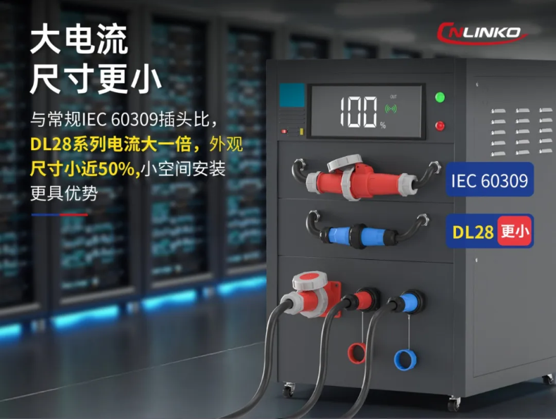 凌科DL28系列大电流工业连接器,相比IEC60309插头,其尺寸减少近50%,而电流承载力却提升一倍。这一特性完美契合了机械臂小型化、高功率密度的设计趋势,在有限的关节空间内,为伺服电机等执行单元提供充沛且可靠的能量传输,助力实现更敏捷的执行动作。