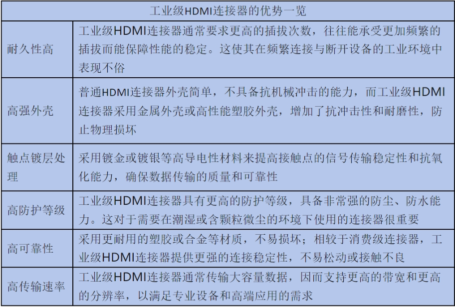 HDMI连接器是一种实现图文、视频等高速传输的高清数据连接器,其应用非常广泛,是非常主流和成熟的数据传输接口方式。对于日常布线,普通的HDMI连接器足矣,但对于户外、医疗、工业等复杂且严苛的使用场景,就需要采纳工业级HDMI连接器,才能保障可靠、安全与稳定的运行。