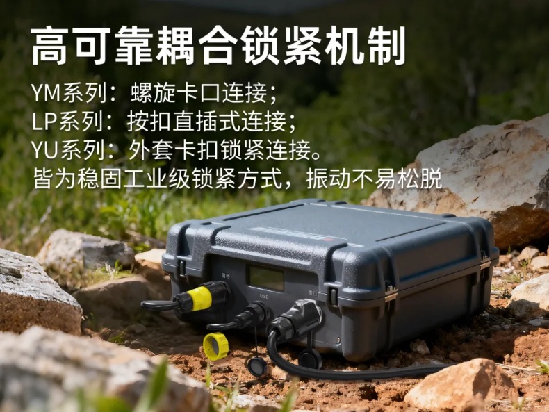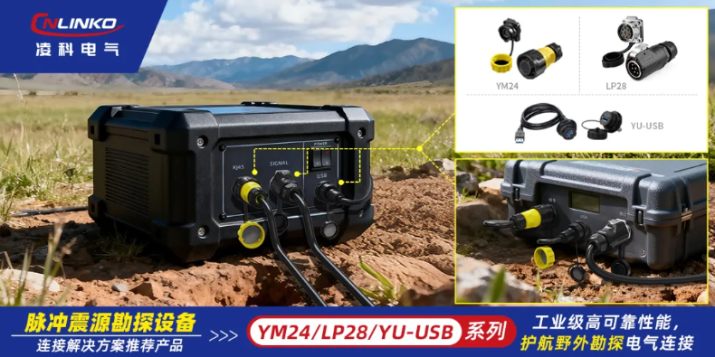 凌科YM系列工业连接器为螺旋卡口连接;LP系列工业连接器为按扣直插式连接;YU系列工业连接器为外套卡扣锁紧连接。皆为稳固工业级锁紧方式,在脉冲震源勘探设备的振动应力下不易松脱。