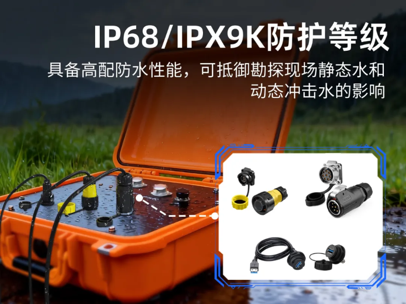 脉冲震源勘探设备属于户外使用的设备,雨水或潮湿是不可控因素,因而工业连接器需具备IP68防护等级及以上。