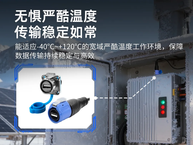 凌科LP20系列工业级防水USB连接器,其全金属插座与配套塑胶插头均可承受高达-40℃~+120℃的严酷温度,有效抵御工控机内部热辐射与外部高温环境,确保在持续高温下性能稳定、不降额。同时还能抵御严寒天气的影响。