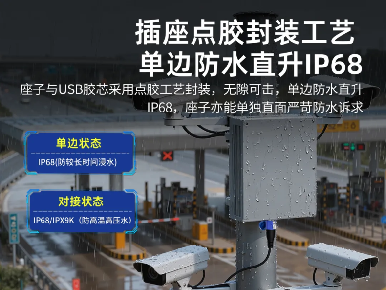 凌科工业级USB连接器实现了连接与断开的全程严密防护:插合时,凭借IP68/IPX9K等级,无惧灰尘与高压冲洗;即便在断开时,插座自身仍具备IP68防护能力,确保内部精密触点安全无忧。