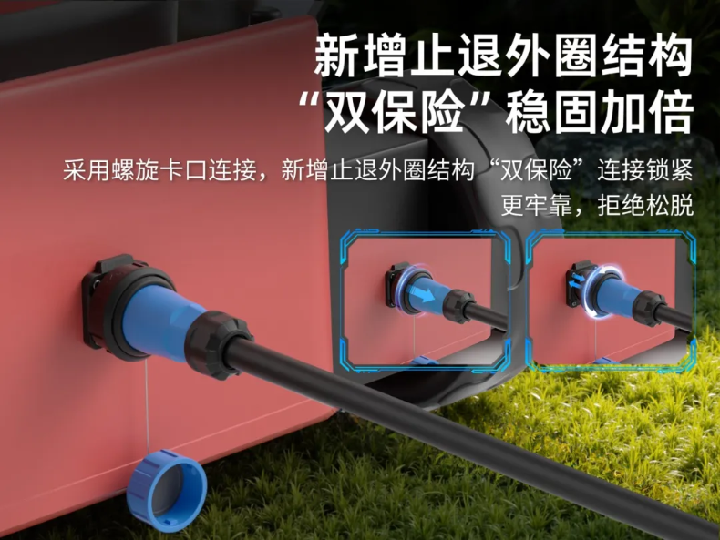 市面上某些大电流连接器,仅满足了大电流与快充而已,其实“安全性”才是用户安心使用的压舱石。对于大电流、强高压的割草机快充,存在两大安全隐患:连接部位松脱导致带电端子暴露和误触高压导电部位。