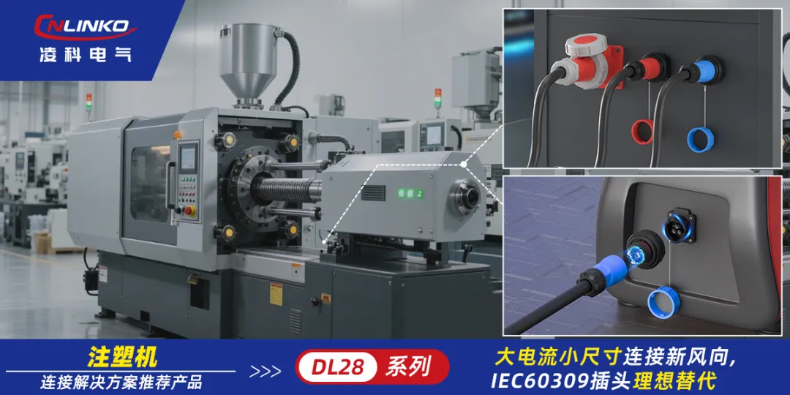 在注塑机紧凑化趋势下,以及安装空间有限的背景下,IEC60309插头因体积过大无法使用。对比IEC60309插头,凌科DL28系列连接器体积小近50%,传输电流值大一倍,可充分匹配注塑机紧凑布线场景,正成为IEC60309插头的理想替代方案,有效解决安装空间痛点。