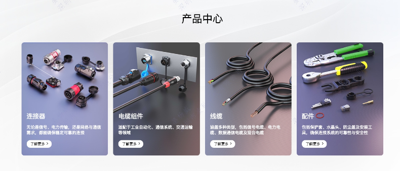 我们构建了“四大产品矩阵”:连接器、电缆组件、线缆、配件,搭配结构化的下拉菜单与清晰导航,帮助你一键直达所需。