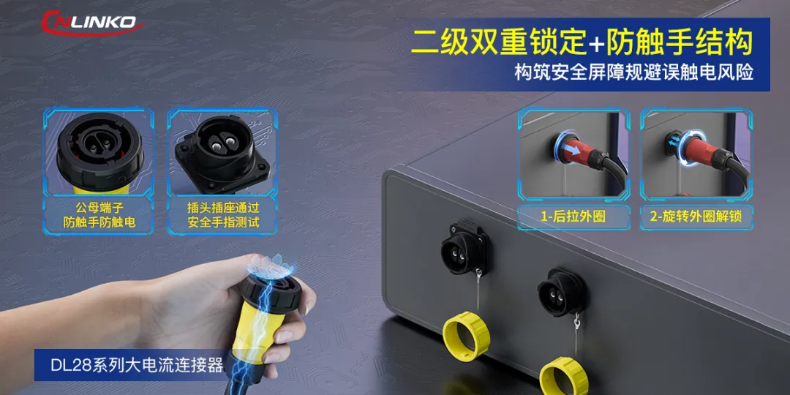 大电流连接器在为工业与智能等行业带来强力支撑时,也要重视大电流、高电压可能存在的安全隐患。DL28系列连接器,凭借防触手和二级锁等安全设计,及比IEC60309插头小近一半等优势,成为紧凑型高安全连接方案新风向。