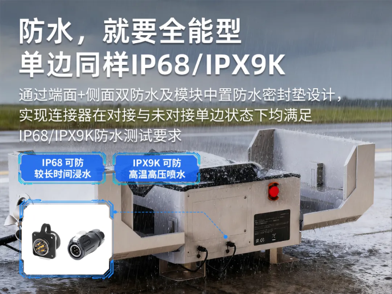 户外潮湿与水液时刻都会对智能停机坪与连接器构成威胁,普通消费级连接器在这一环境下随时就会失效与宕机。而具备高防护等级的工业级连接器却能保障不进水、不渗水,更安全。