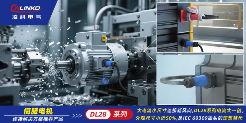 凌科DL28系列工业连接器,正成为伺服电机领域深受青睐的连接方案产品。相较传统IEC60309插头,DL28实现体积小近一半,电流传输大一倍的突破。解决了电机高密度集成的空间瓶颈,更以抗振、高防水、强耐蚀、人机安全等显著优势,成为工业动力领域高可靠、更安全、紧凑化电气连接的理想选择。
