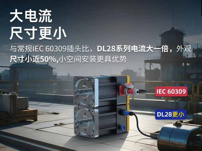 在大电流连接器品类中,DL28系列工业级连接器绝对是小巧紧凑的存在。对比市场上的IEC60309插头,DL28系列尺寸小近50%,这降维打击式的外观尺寸优势,让现代伺服电机紧凑化发展如虎添翼。