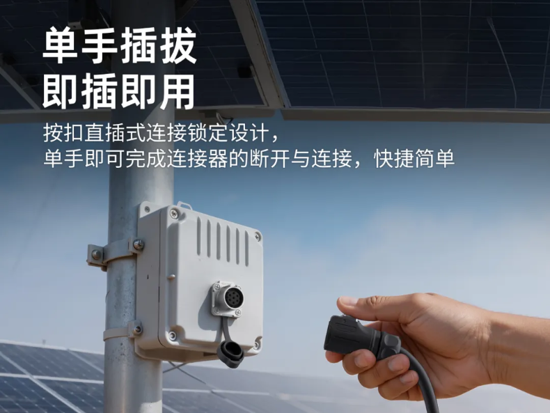 连接器的即插即用,单手操作特性,对于太阳能推拉杆设备非常具有吸引力,既提高操作效率和体验感,而且对于后续维检设备也是大有裨益。