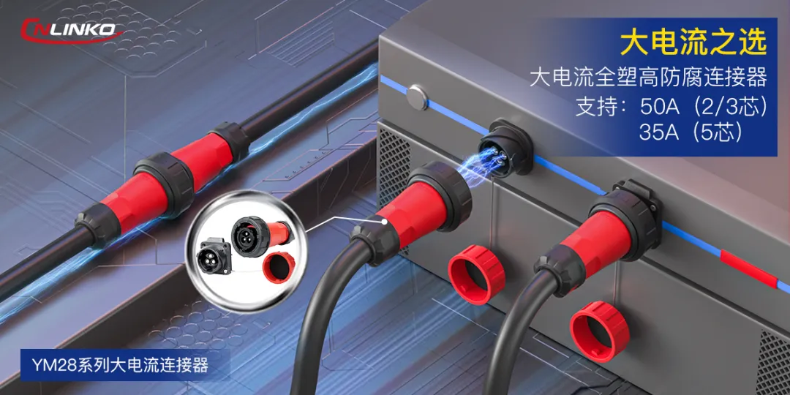 凌科YM28系列工业连接器是一款全塑外壳的高防腐型大电流连接器。支持50A(2/3芯)与35A(5芯)大电流规格,具备非常卓越的优势: