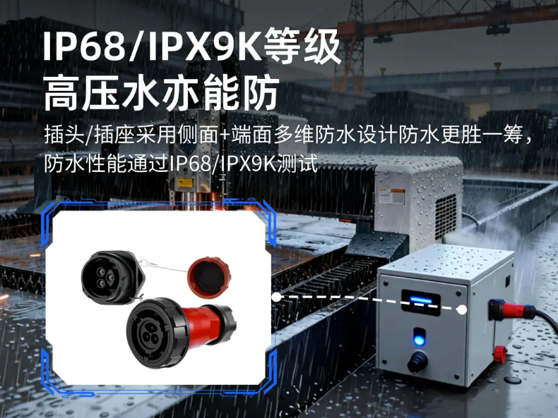 DL28系列工业级大电流连接器通过了IP68(防尘、防水浸泡)及IPX9K(防高压高温水射流)双重测试。这不仅可防护溅水,更能应对设备清洁或恶劣环境下的高压水,从而确保连接器在激光切割机复杂工况下的长期可靠性。