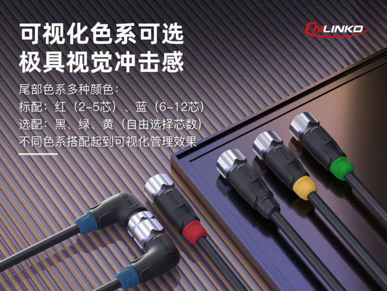 ②另可自选自配:黑、绿、黄(自由选择芯数),这样一来,所用4芯和8芯的LM12电缆组件通过颜色区分,一眼即辨,不会出现盲拆或记错,导致误拔连接器造成维护人员的不便之处。