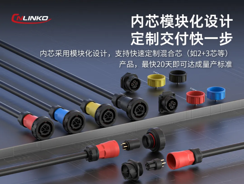 该款连接器采用可拆卸的内芯模块设计,支持客户的非标芯数规格款型定制需求(如2+3芯混合芯规格)。客户的专属定制方案从需求确认到达成量产化标准,最快仅需20天。