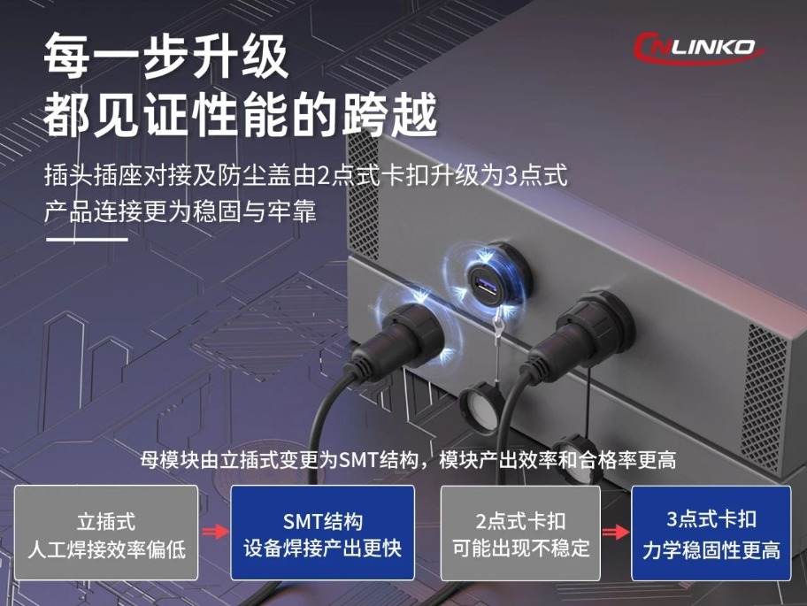 作为YU系列的2.0版,其在结构与工艺上作了较大的升级。其一,插头插座对接及防尘盖由2点式卡扣升级为3点式,力学稳固性更强,结构不易出现松动等现象;其二,母模块由立插式变更为SMT结构,设备焊接产出更快,产品的一致性更高。总而言之,2.0版其性能实现了进一步升级。